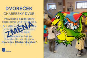 Dvoreček probíhá v Chaberském dvoře pravidelně každé úterý dopoledne 9:45–10:45 hod. Prosíme maminky o respektování včasného příchodu mezi od 9:30–9:45 hod.