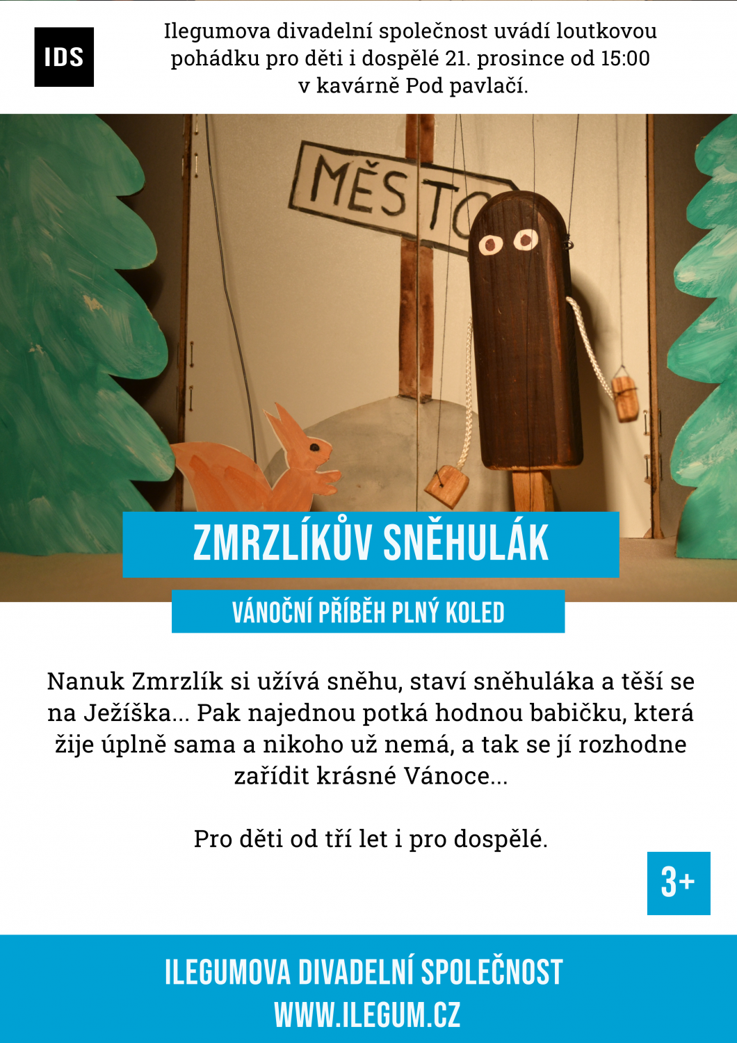 Ilegumova divadelní společnost zve na loutkovou inscenaci Zmrzlíkův sněhulák.