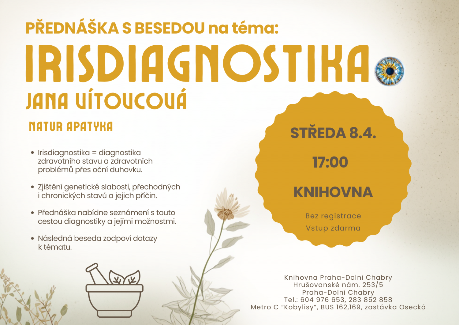 Pozvánka na přednášku spojenou s následnou besedou nejen pro rodiče dětí, ale i ostatní dospělé, které trápí zdravotní problémy. Přednáška seznámí účastníky s metodou irisdiagnostiky. To je způsob diagnostiky celkového stavu organismu přes oční duhovku, pomáhající odhalit genetické slabosti, přechodné aktuální stavy i chronické. Cílem IRISDIAGNOSTIKY je především zjištění hlavních příčin konkrétního zdravotního problému, které orgány nebo systémy jsou oslabené a proč. Případně upozornit na blížící se zdravotní problémy ještě před jejich propuknutím. Na závěr beseda.