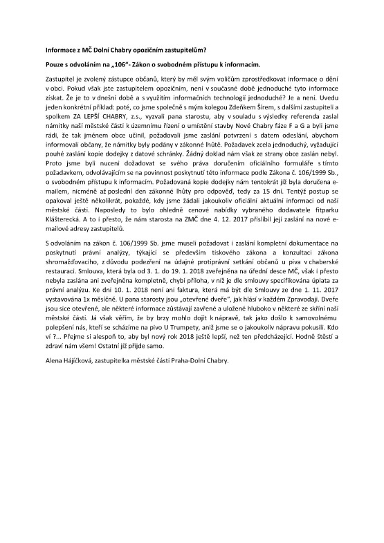 Informace z MČ Dolní Chabry opozičním zastupitelům?