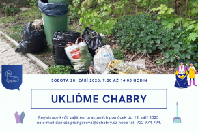 V případě zájmu o pytle a úklidové pomůcky se nezapomeňte registrovat do pátku 12. září na e-mailu daniela.pisingerova@dchabry.cz nebo na tel. 722 974 794 u Daniely Pisingerové. Pomůcky se budou vydávat ráno na srazu v Chaberském dvoře, kde budou pracovníky úřadu a gestorem akce místostarostou Stanislavem Vyšínem předány tipy na místa, která jsou vhodná k pořádnému vyčištění. Uklízet ale samozřejmě můžete i v lokalitách, které si vyberete sami.